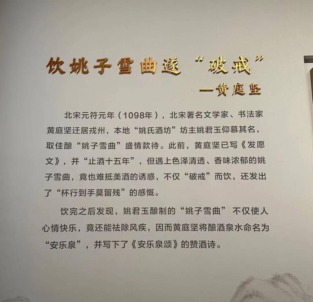 宜賓古稱戎州。公元1098年,北宋詩人、大書法傢黃庭堅被貶謫戎州。在戎州,黃庭堅受到當地文人雅士的熱情迎接,其中“姚氏酒坊”坊主姚君玉取自釀的“姚子雪曲”盛情款待,黃庭堅時隔15年重新舉起瞭酒杯,飲後連連稱贊,寫下一曲《安樂泉頌》,“姚子雪曲,杯色爭玉。得湯鬱鬱,白雲生谷。清而不薄,厚而不濁。甘而不噦,辛而不螫。”