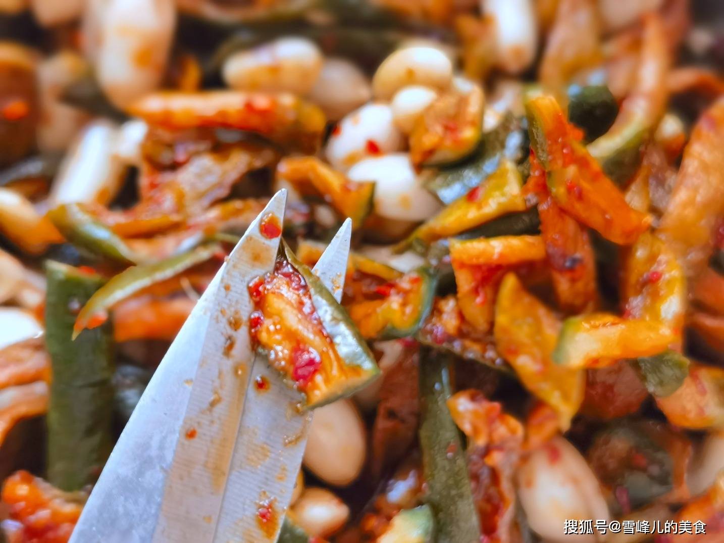 第六步:繼續用手充分拌勻,把蘿卜幹用剪刀剪開成小顆粒狀。