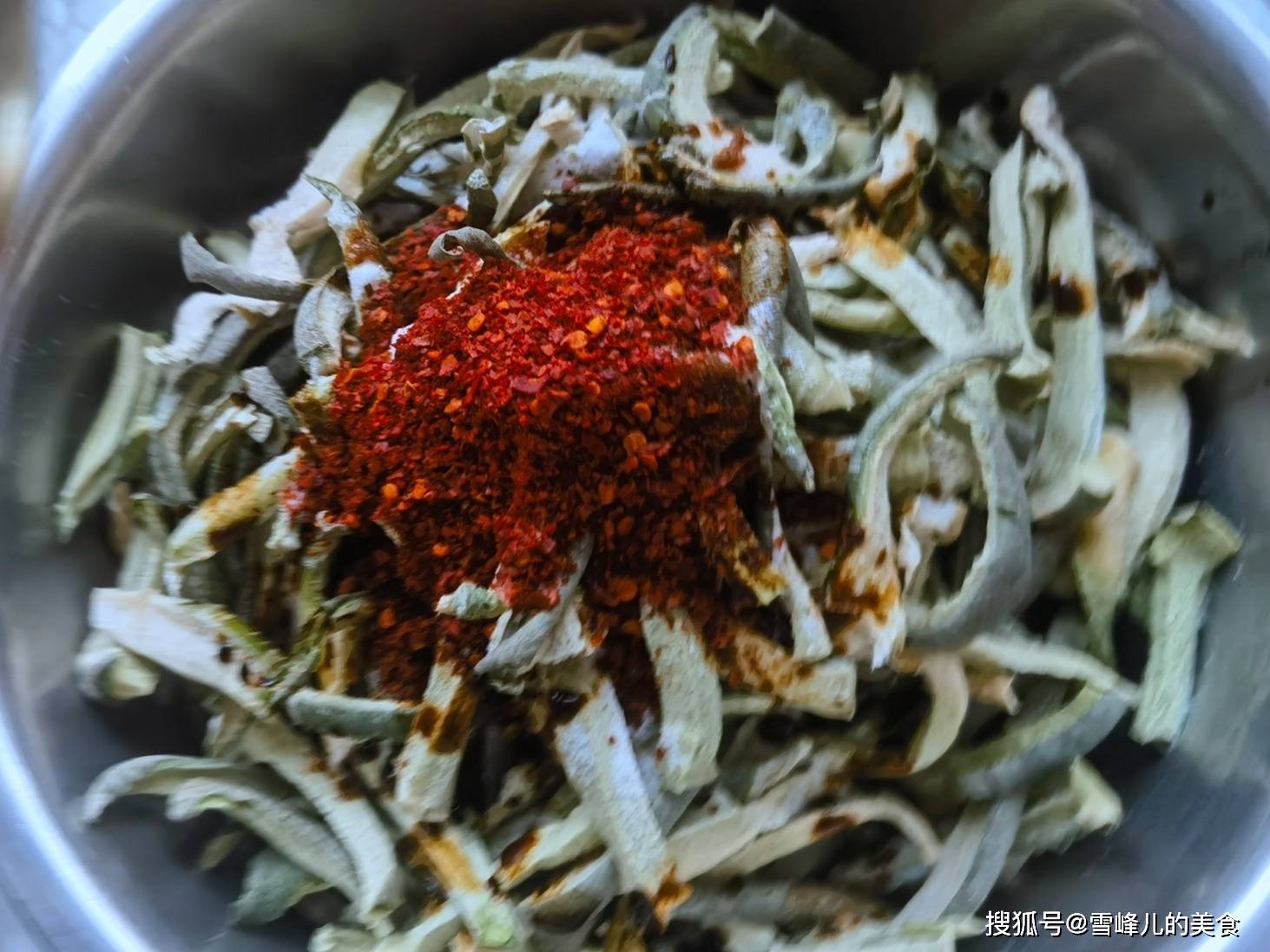 第三步:把蘿卜幹放到盆裡,加入生抽,醋,鹽,辣椒粉,高度白酒來調制味道。高度白酒的作用就是殺菌,這樣做出的小菜不會壞,吃一個冬天都不會壞。