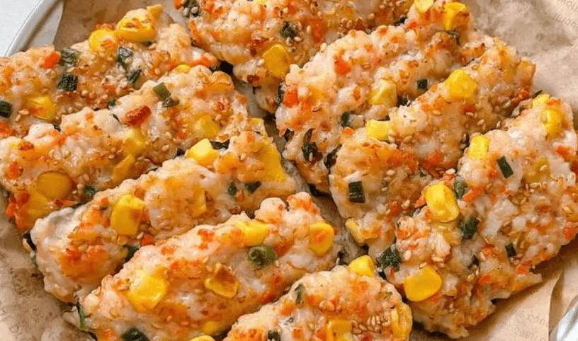 步驟1:將胡蘿卜玉米煮熟切碎,蔥花切小段,上述食材放入蝦肉泥中,加入兩勺寶寶醬油和少許淀粉攪拌均勻。