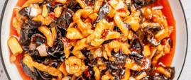 午餐:珍珠米飯、新疆大盤雞、青椒回鍋肉、木耳肉片、肉末燒豆腐、下鍋耙、泡椒土豆片、海帶湯