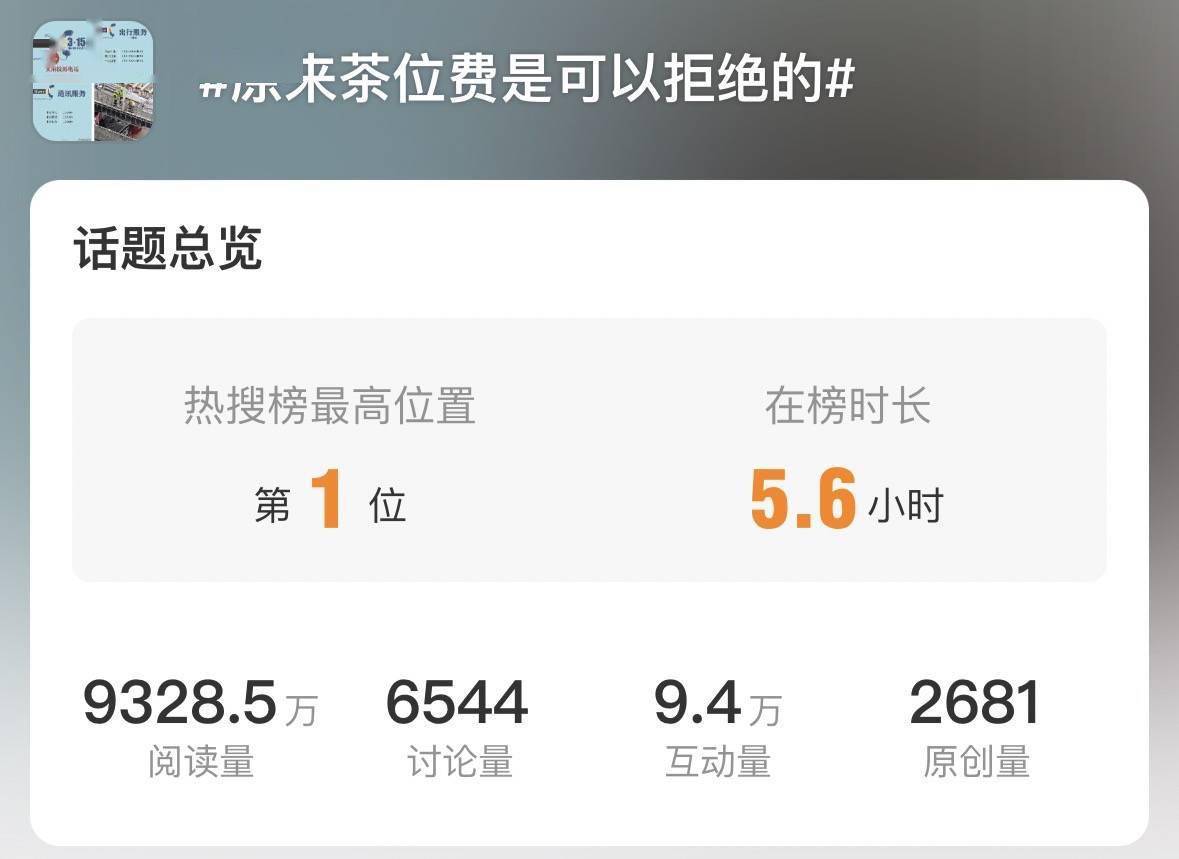 日前,話題#原來茶位費是可以拒絕的#沖上微博熱搜排行榜第一名,閱讀量超過9300萬,近10萬人參與話題討論。有網友稱:“10個人去吃飯,啥都還沒點,茶位費就先收瞭100元。”