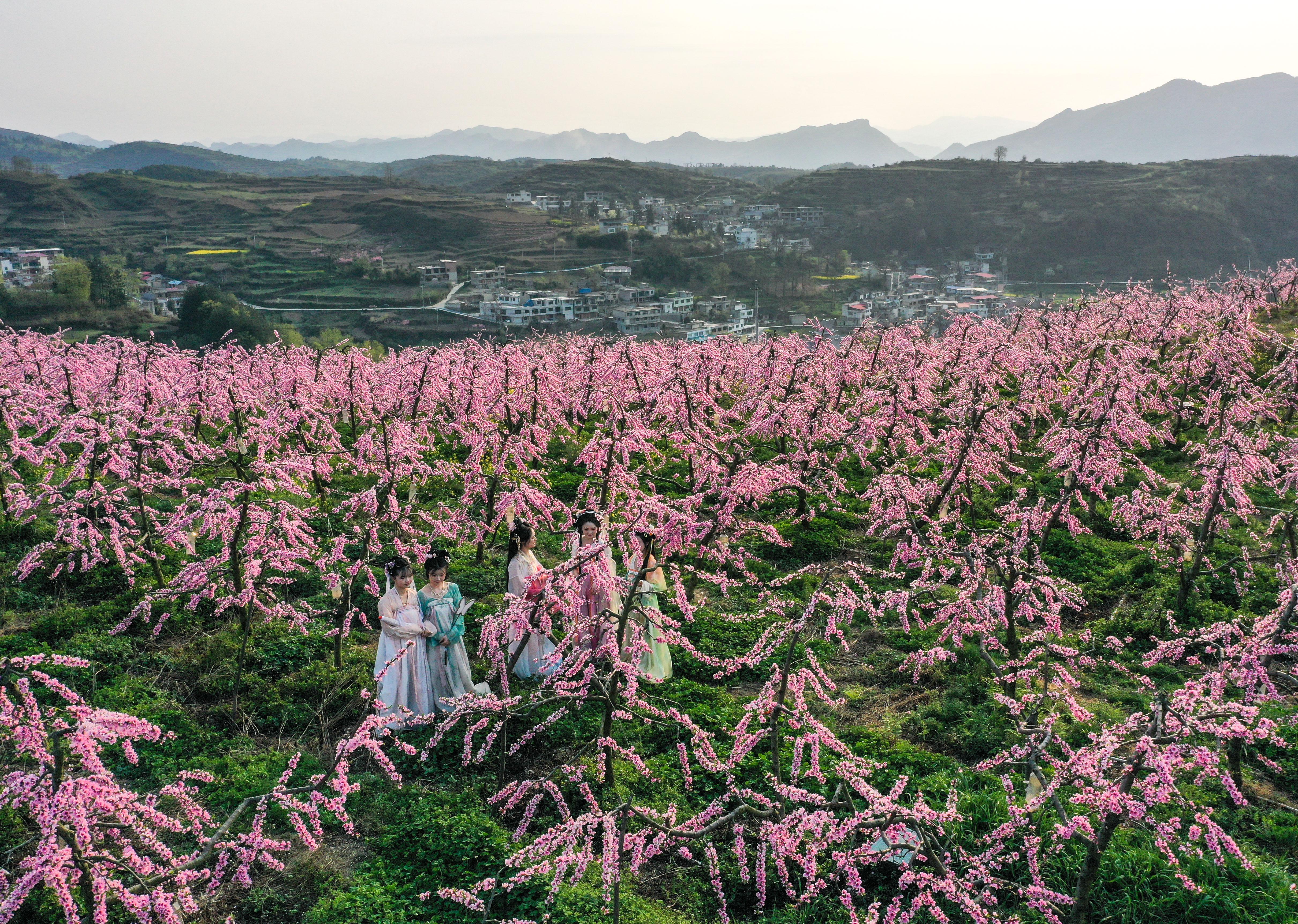 4月1日,汉服爱好者在贵州省贵定县德新镇新铺村黄桃种植基地游玩留影(无人机照片)。