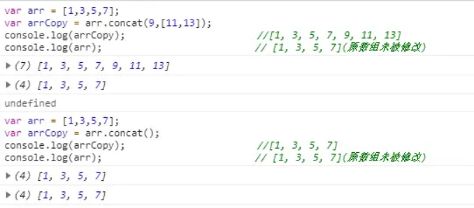 concat():将参数添加到原数组中。这个方法会先创建当前数组的一个副本,然后将接收到的参数添加到这个副本的末尾,最后返回新构建的数组。在没有给concat()方法传递参数的 情况下,它只是复制当前数组并返回副本。