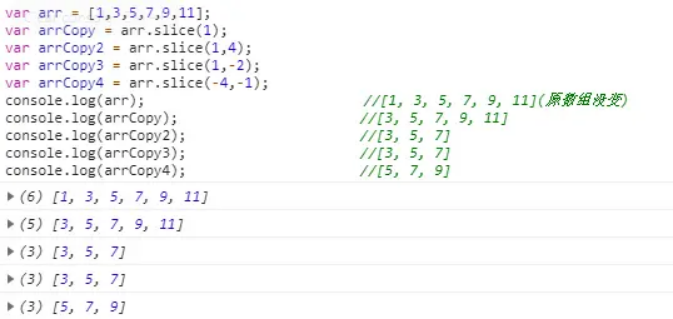 slice():返回从原数组中指定开始下标到结束下标之间组成的新数组。slice()方法可以接受一或两个参数,即要返回项的起始和结束位置。在只有一个参数的情况下, slice()方法返回从该参数指定位置开始到当前数组末尾的所有项。如果有两个参数,该方法返回起始和结束位置之间的项——但不包括结束位置的项。
