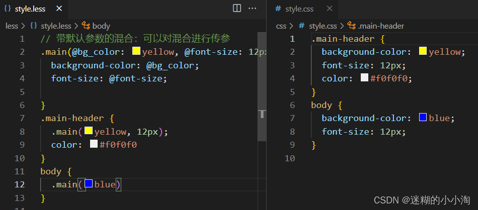 less中混合使用类选择器或id选择器定义,使用时引入该类选择器或id选择器,混合可以传入参数~