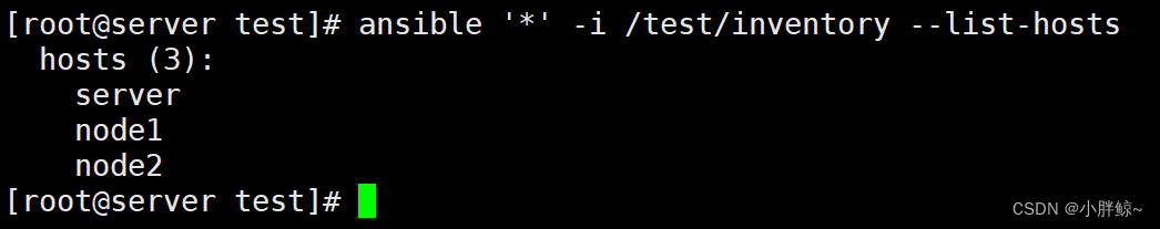 [root@server test]# ansible '*' -i /test/inventory --list-hosts