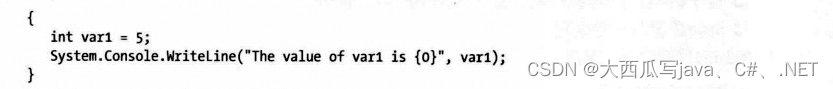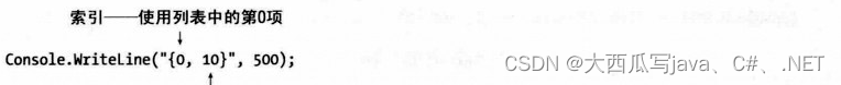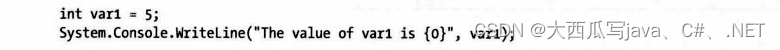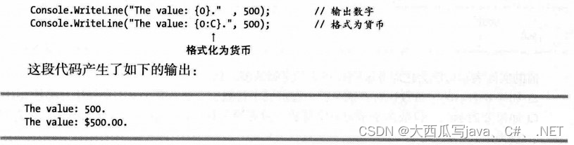 贯穿本书的示例代码会使用WriteLine方法来显示值。每次,我们都使用由大括号包围整数组成的简单替代标记形式。