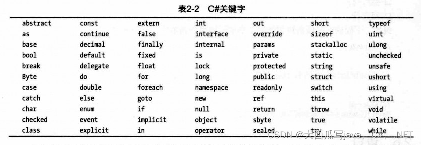 关键字是用来定义C#语言的字符串记号。表2-2列出了完整的C#关键字表。