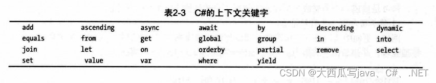 上下文关键字是仅在特定语言结构中充当关键字的标识符。在那些位置,他们有特别的含义。两者的区别是,关键字不能被用作标识符,而上下文关键字可以在代码的其他部分被用作标识符。上下文关键字如表2-3所示。
