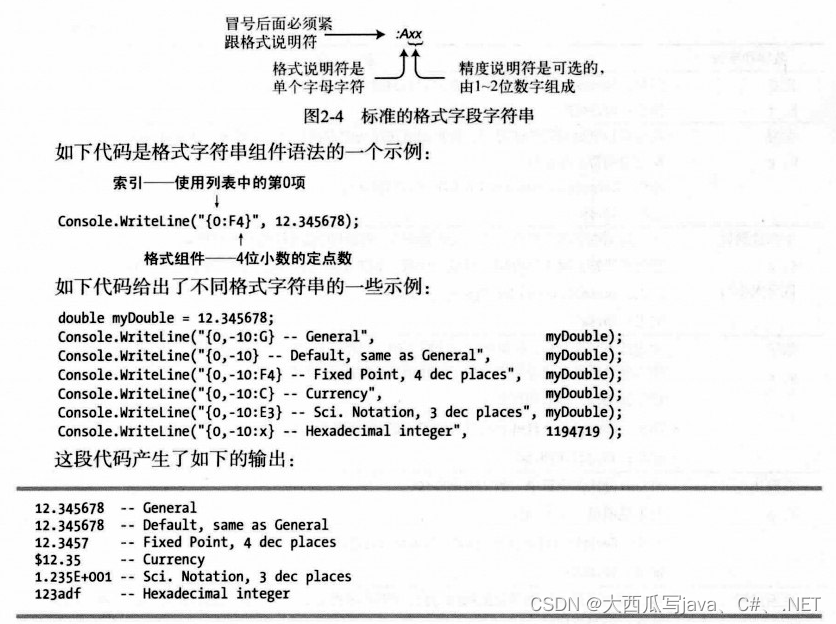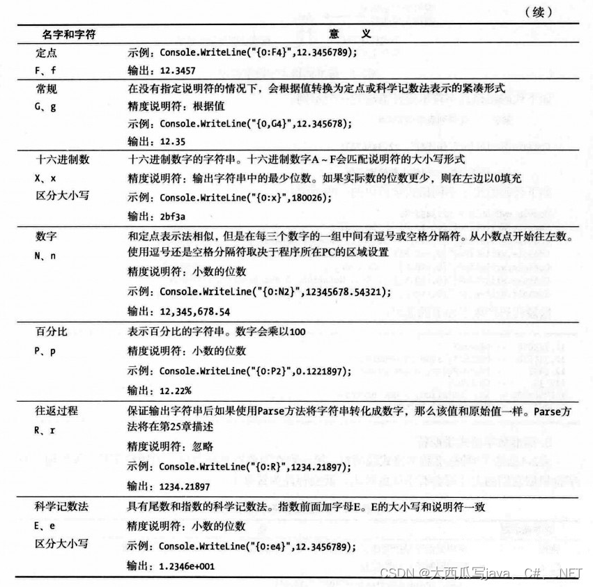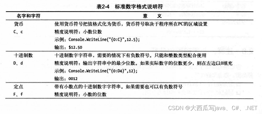 表2-4总结了9种标准数字格式说明符。第一列在说明符后列出了说明符字符。如果说明符根据他们的大小写会有不同的输出,就会标注为区分大小写。