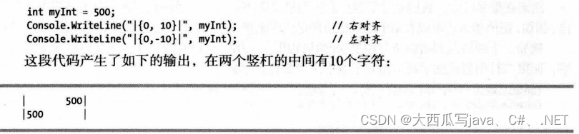 列如,如下格式化int型变量myInt的值的代码显示了两个格式项,在第一个示例中,myInt的值以在10个字符的字符串中右对齐的形式进行显示;第二个示例中则是左对齐。格式项放在两个竖杠中间,这样在输出中就能看到他们的左右边界。