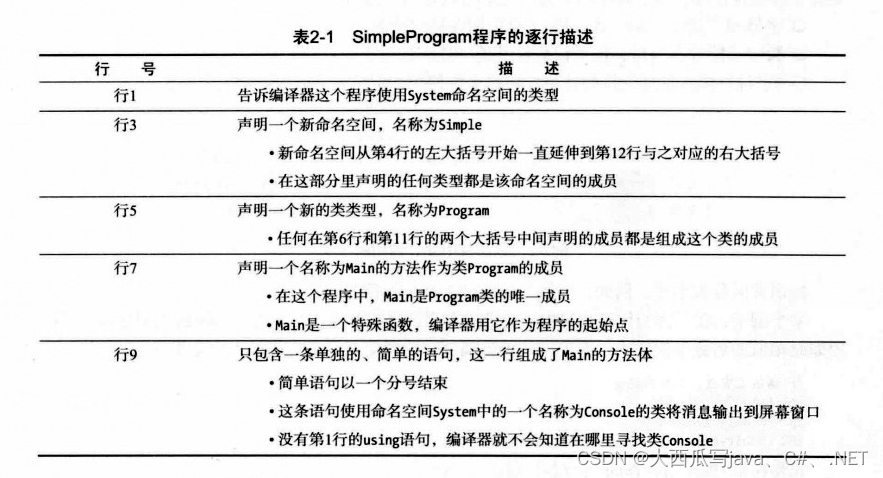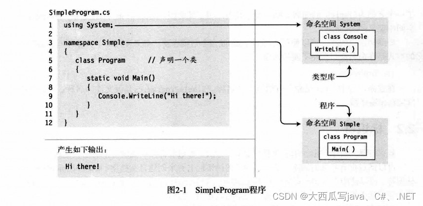 让我们先观察一个简单的C#程序。完整的源程序在图2-1上面的阴影区域中。如图所示。代码包含在一个名为SimpleProgram.cs的文件里当你阅读它时,不要担心能否理解其中的所有细节。表2-1对代码进行逐行描述。在左下角的阴影区域展示了程序的输出结果,右半边是程序各部分的图形化描述。