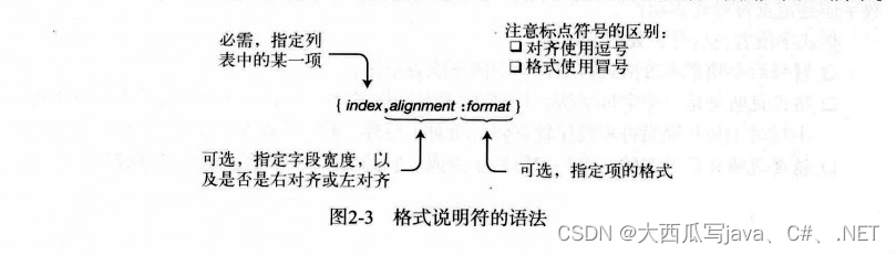 两条语句的不同之处在于,格式项以格式说明符包括了额外信息。大括号内的格式说明符的语法由三个字段组成:索引号、对齐说明和格式字段(format field)。语法如图2-3所示。