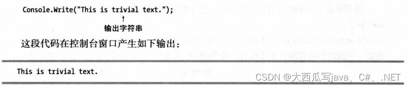 Write是Console类的成员,它把一个文本字符串发送到程序的控制台窗口。最简单的情况下下,Write将文本的字符串字面量发送到窗口,字符串必须使用双引号括起来。