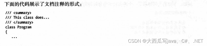 C#还提供第三种注释:文档注释。文档注释包含XML文本,可以用于产生程序文档。这种类型的注释看起来像单行注释,但是他们有三个斜杠而不是两个。文档注释会在25章节阐述。