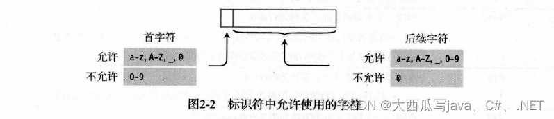 的标识符,可以使用大写和小写字母(如CardDeck、PlayersHand、FirsName和SocialSecurityNum)。某些字符能否在标识符中特定的位置出现是有规定的,这些规定如图2-2所示。