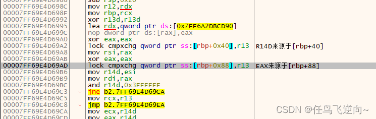 我们在下面的数组上下断,获取到真正发包时的rbp的值,并对+40和+88进行下断观察,可以发现+88是决定代码流程的关键,因为有的时候+40不变,而+88会改变,此时恰好会让二者不相等,实现真的发包。