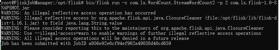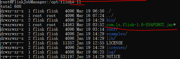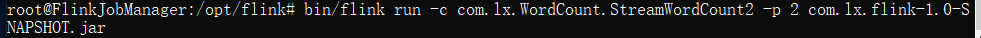 docker cp/mnt/d/JetBrains/Work_Project/com.lx.flink-1.0-SNAPSHOT.jar599b7611e14a:/opt/flink进入jobmanager的容器中: