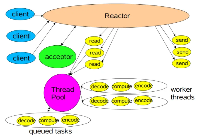 Reactor 模式一般翻译成反应器模式,也有人称为分发者模式。是基于事件驱动的设计模式,拥有一个或多个并发输入源,有一个服务处理器和多个请求处理器,服务处理器会同步的将输入的请求事件以多路复用的方式分发给相应的请求处理器。简单来说就是 由一个线程来接收所有的请求,然后派发这些请求到相关的工作线程中。