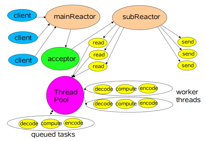主从 Reactor 多线程模型的优点在于主线程和子线程分工明确,主线程只负责接收新连接,子线程负责完成后续的业务处理,同时主线程和子线程的交互也很简单,子线程接收主线程的连接后,只管业务处理即可,无须关注主线程,可以直接在子线程将处理结果发送给客户端。