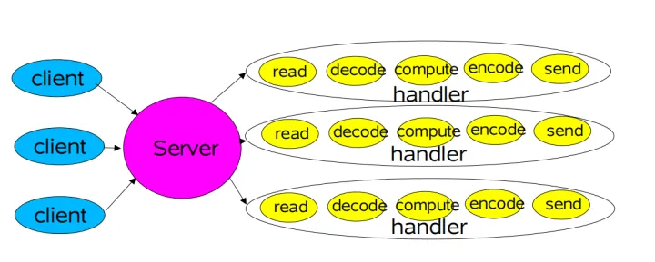 单线程的问题实际上是很明显的。只要其中一个 Handler 方法阻塞了,那就会导致所有的 client 的 Handler 都被阻塞了,也会导致注册事件也无法处理,无法接收新的请求。所以这种模式用的比较少,因为不能充分利用到多核的资源。因此,这种模式仅仅只能处理 Handler 比较快速完成的场景。