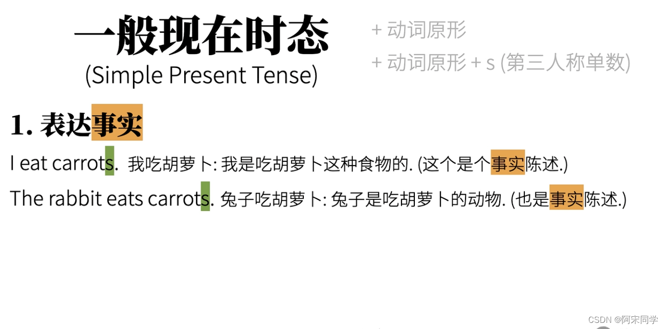最主要的是,很多同学容易吧 “现在” 时间 和 “一般” 状态 弄混淆。一看到 “现在” 俩字,有些人本能就觉得,那一定就是现在正在进行中的动作咯?可是 I eat carrots 可不是我 “正在” 吃胡萝卜的意思。