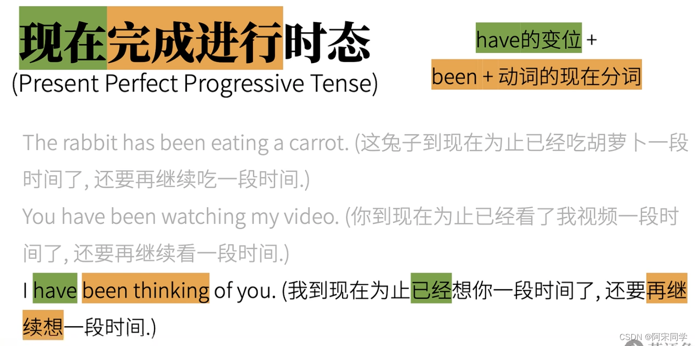 对现在而言的,完成了的,但是接下来还会继续的状态,现在完成进行时态(Present Perfect Progressive Tense)如:这兔子现在已经吃完了一些胡萝卜,但它还要继续吃。