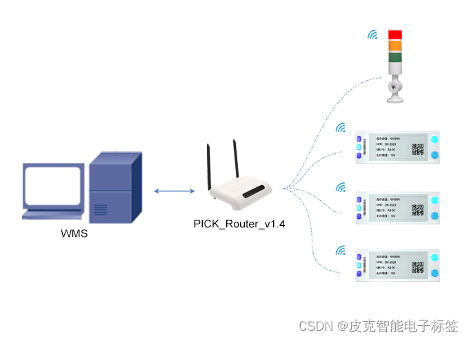 电子标签拣货系统就是通过PC机或扫描枪发送指令,通过路由器转发,控制电子标签上的LED灯或屏幕指引拣货人员准确,快速地到指定的位置拣取相应的货物。