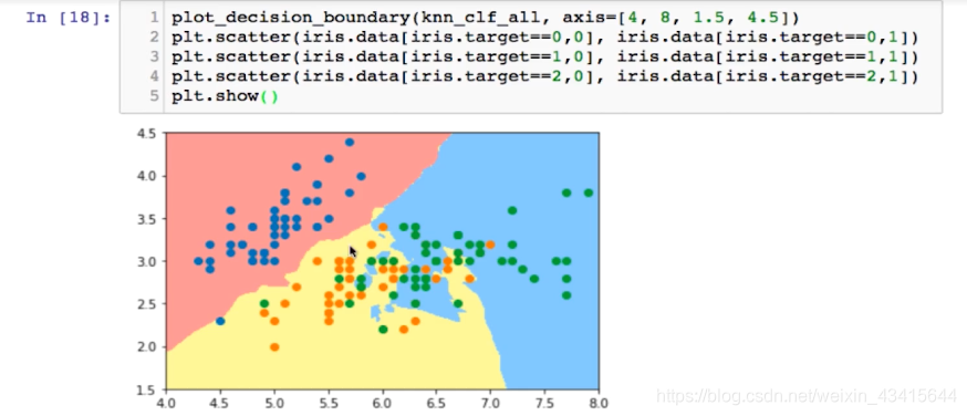 那么我们根据不同分类值所占领的区域 就可以圈出决策边界