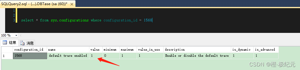 Trace作为一个很好的数据库追踪工具,在SQL Server 中便集成到系统功能中去,并且默认是开启的,当然我们也可以手动的关掉它,它位于sp_config配置参数中,我们可以通过以下语句查看: