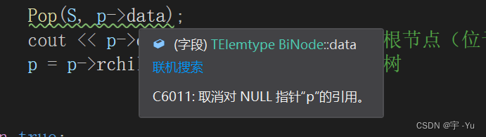 {BiTree p = T;//用于访问结点的指针SqStack S;InitStack(S);while (p || StackEmpty(S)){if (p)//p不为空,有(根)结点//另外这里注意,我们无法构造定义出“空结点/空树”,不要浪费力气了{Push(S, p->data);// 把根结点存到栈里p->lchild;// 访问(指针指向)左子树}else//(根)结点为空{Pop(S, p->data);cout << p->data;// 输出上一层的根节点(位于栈顶)p = p->rchild;//指针指向根节点的右子树}} return true;