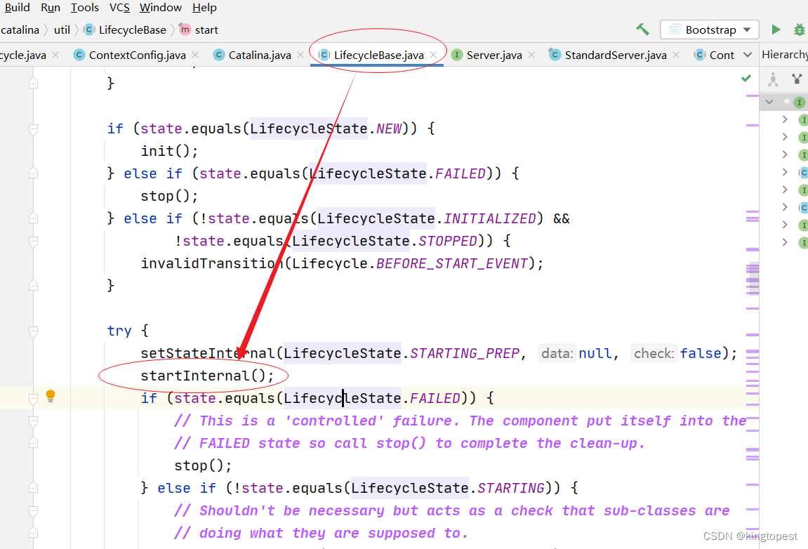 然后startInternal方法又会跳回到Lifecycle接口,注意到startInternal方法是一个抽象方法,这是典型的模板方法设计模式, 也就是他的子类必须重写该方法,此时我们应该选择哪一个实现类呢?因为实现类下面有很多选项。前面的getServer已经提到上面执行的实际是StandardServer的start方法,所以这里应该选择StandardServer作为startInternal方法的实现类。