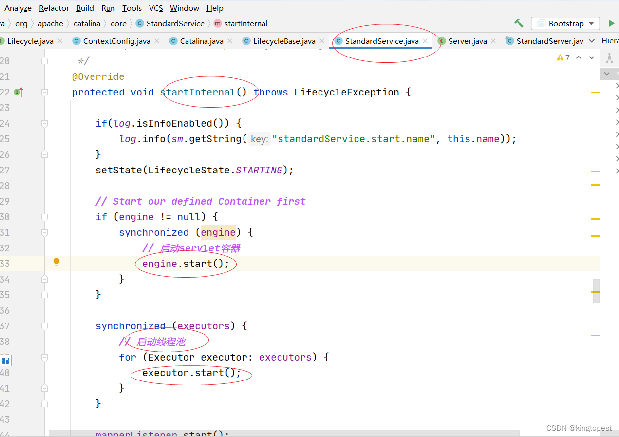 startInternal方法是实现类选择StandardService,因为上面方法的执行源头是service.start,而service实际就是StandardService.