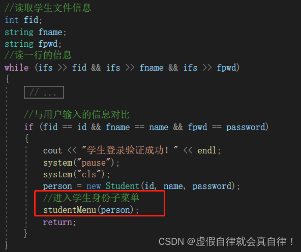 {this->m_Id = id;this->m_Name = name;this->m_Password = password;//初始化机房信息 读取信息ifstream ifs;ifs.open(COMPUTER_FILE, ios::in);ComputerRoom com;while (ifs >> com.m_ComId && ifs >> com.m_MaxNum){vCom.push_back(com);//读到的信息存在vector容器中}ifs.close();