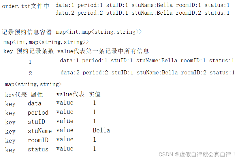 {ifstream ifs(ORDER_FILE, ios::in);//接收预约文件各信息变量string date;string period;string stuID;string stuName;string roomID;string status;this->m_Size = 0;//初始化为0while ( ifs >> date && ifs >> period && ifs >> stuID&& ifs >> stuName && ifs >> roomID && ifs >> status){//测试/*cout << data << endl;cout << period << endl;cout << stuID << endl;cout << stuName << endl;cout << roomID << endl;cout << status << endl;*/map m;//截取日期/*//截取key value值并存入map小容器中 统一用stringstring key;string value;map m;//截取日期int pos = data.find(':', 0);key = data.substr(0, pos);value = data.substr(pos + 1, data.size() - pos - 1);m.insert(make_pair(key, value));*/m.insert(subdata(date));//截取时间段m.insert(subdata(period));//截取学生学号m.insert(subdata(stuID));//截取学生姓名m.insert(subdata(stuName));//截取机房号m.insert(subdata(roomID));//截取机房预约状态m.insert(subdata(status));//放进大容器中m_order.insert(make_pair(this->m_Size, m));//更新this->m_Size++;m.clear();//释放 存放下一条预约记录}ifs.close();//测试/*for (map>::iterator it = m_order.begin(); it != m_order.end(); it++){cout << "条数为:" << it->first << "\tvalue如下:" << endl;for (map::iterator mit = it->second.begin(); mit != it->second.end(); mit++){cout << "key = " << mit->first << "\tvalue = " << mit->second << endl;}cout << endl << endl;}*/