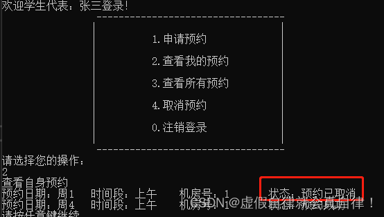 {orderFile order;if (order.m_Size == 0){cout << "没有预约记录!" << endl;system("pause");system("cls");return;}cout << "审核中或预约成功的记录可以取消,请输入取消的记录" << endl;int index = 1;//记录该学生有多少条预约记录vector v;//存放该学生符合取消条件的预约记录//找到要取消预约的学生 以及该学生可以取消的预约记录for (int i = 0; i < order.m_Size; i++){//找到要取消预约的学生 string→const char *→intif (atoi(order.m_order[i]["stuID"].c_str()) == this->m_Id){//找到符合取消的预约记录 审核中1 预约成功2if (order.m_order[i]["status"] == "1" || order.m_order[i]["status"] == "2"){//保存可以取消的预约记录的真实下标,对应m_order的key v.push_back(i);//展示该学生预约的所有记录 从1开始遍历 输出index 再+1 cout << index++ << "、 ";//有可能张三的记录在第一个、第二个、第四个cout << "预约日期:周" << order.m_order[i]["date"];cout << "预约时间段:" << (order.m_order[i]["period"] == "1" ? "上午" : "下午");cout << "\t机房号:" << order.m_order[i]["roomID"];string status = "\t状态:";if (order.m_order[i]["status"] == "1"){status += "审核中";}else if (order.m_order[i]["status"] == "2"){status += "预约成功";}cout << status << endl;}}}//取消预约cout << "请输入要取消的预约记录,0代表返回" << endl;int select = 0;while (true){cin >> select;//select范围:0-所有符合取消条件的预约记录的个数if (select >= 0 && select <= v.size()){if (select == 0){break;}else{order.m_order[v[select - 1]]["status"] = "0";order.updateOrder();cout << "已取消预约" << endl;break;}}else{cout << "输入有误,请重新输入" << endl;}}system("pause");system("cls");